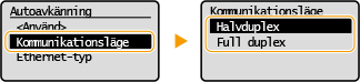 Sänder och tar emot kommunikationsdata alternerande. Välj det här alternativet om enheten är ansluten till en nätverksenhet med halv duplex. <Full duplex>