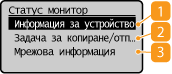 Когато изберете <Статус монитор>, се показва екран, в който можете да проверите напредъка на обработката на документ, състоянието на устройството (количеството тонер, оставащо в тонер касетите, и т.н.) и мрежовите настройки, като например IP адреса на устройството.