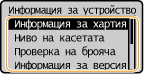 Показва състоянието на устройството, като например оставащото количество в тонер касетите и др.