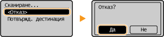 Ако искате да отмените изпращането на документи веднага след стартиране на сканирането изберете <Отказ> на дисплея или натиснете