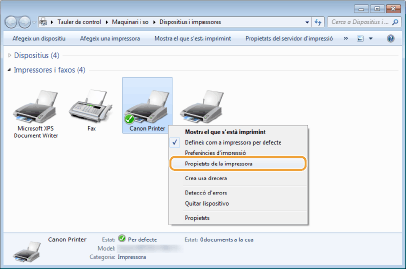Feu clic amb el botó dret a la icona del controlador de la impressora i feu clic a [Propietats de la impressora] o [Propietats].