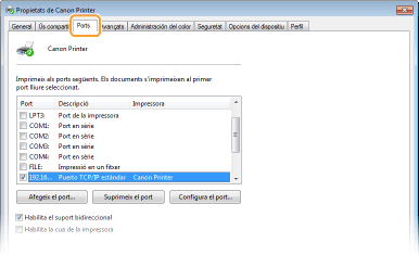 Si la [Descripció] del port seleccionat és [Port Canon MFNP] i tant l'equip com l'ordinador són a la mateixa subxarxa, la connexió es manté. No cal que afegiu cap port nou. Si la descripció és [Port TCP/IP estàndard], heu d'afegir un port nou. Configuració de ports d'impressora