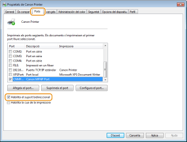 A la pestanya [Ports], assegureu-vos que la casella [Habilita el suport bidireccional] estigui marcada.
