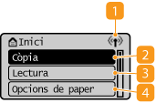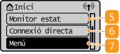 <Monitor estat>Seleccioneu aquest element per comprovar l'estat d'impressió, per veure l'historial d'ús o per veure les opcions de xarxa, com ara l'adreça IP de l'equip. També podeu comprovar l'estat de l'equip, com ara les quantitats restants al cartutx de tòner, o consultar si s'ha produït algun error. Pantalla <Monitor d'estat>
