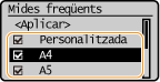 Podeu establir que només les mides de paper que feu servir habitualment es mostrin a la pantalla <Mides freqüents> per seleccionar la configuració de la mida de paper.
