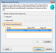 Seleccioneu primer [Detecció automàtica] i, a continuació, l'equip quan es detecti; després, feu clic a [Següent].