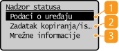 Prikazuje status uređaja, kao što je preostala količina tonera u spremnicima i sl.