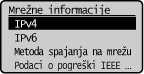 Prikazuje mrežne postavke, npr. IP adresu uređaja, i status, npr. stanje komunikacije putem bežičnog LAN-a.