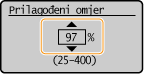 Kopije možete povećati ili smanjiti pomoću unaprijed postavljenih omjera kopiranja, kao što je <A5->A4>, ili pak postavljanjem prilagođenog omjera kopiranja u koracima od 1 %.