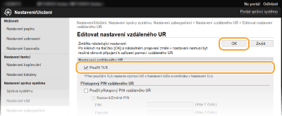 Použití ovládacího paneluPomocí možnosti <Nabídka> na obrazovce Domů také můžete povolit nebo zakázat komunikaci šifrovanou pomocí protokolu TLS. <Použít TLS>