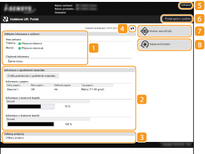 Když se přihlásíte do Vzdáleného uživatelského rozhraní, objeví se následující stránka portálu. V této části jsou popsány položky zobrazené na stránce portálu a základní operace.