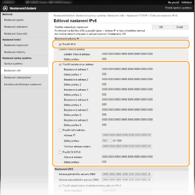 Adresy IPv6 zařízení lze nakonfigurovat pomocí Vzdáleného uživatelského rozhraní. Před nastavením adres IPv6 zkontrolujte nastavení adresy IPv4 (Zobrazení nastavení IPv4). Chcete-li používat adresy IPv6, je třeba správně nastavit adresu IPv4. Upozorňujeme, že v prostředí IPv6 není dostupná funkce skenování, která používá ovladač skeneru nebo nástroj MF Scan Utility. Zařízení může používat více následujících adres IPv6: