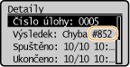 Pokud dojde k chybě, například se nepodaří tisk, na obrazovce protokolu úloh se zobrazí příslušný kód chyby formou tříciferného čísla. Dále je uveden popis příčin a řešení náležející k jednotlivým chybovým kódům. Podrobnosti o obrazovce protokolu úloh najdete v části