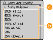 Μπορείτε να μεγεθύνετε ή να σμικρύνετε τα αντίγραφα χρησιμοποιώντας μια ειδική κλίμακα αντιγραφής, όπως η <A5->A4>, ή ρυθμίζοντας μια προσαρμοσμένη κλίμακα αντιγραφής σε βήματα του 1 %.