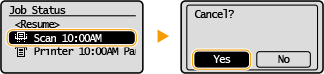 מסמכי המקור נסרקו וממתינים לעיבוד. בחר במסמך שברצונך לבטל ובחר <Yes>.