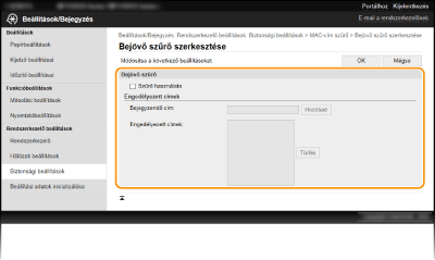 Ha helytelen MAC-címeket ad meg, előfordulhat, hogy nem fog tudni hozzáférni a készülékhez a Távoli felhasználói felületről. Ebben az esetben a <MAC-cím szűrő> beállítást a <Ki> értékre kell állítani. <MAC-cím szűrő>