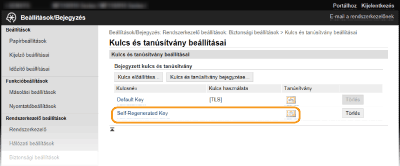 Ha a kulcsot és a tanúsítványt valamelyik funkció használja, ha például a „[TLS]” felirat látható a [Kulcs használata] mezőben, a kulcs és a tanúsítvány nem törölhető. Ebben az esetben a kulcs törlése előtt ki kell kapcsolni a funkciót, vagy le kell cserélni a kulcsot és a tanúsítványt.