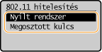 Ha a készülék vezeték nélküli hálózathoz csatlakozik, és a vezeték nélküli útválasztón megosztott kulcsos hitelesítés van beállítva, akkor a készülék hitelesítési hibát észlel. Ilyenkor a készülék automatikusan a <Megosztott kulcs> beállításra vált, és ismét megpróbálkozik a csatlakozással.