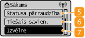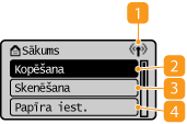 <Izvēlne>Izmantojot šo vienumu, var piekļūt daudziem iekārtas iestatījumiem, piemēram, <Tīkla iestatījumi>, <Preferences>. Iestatījumu izvēlnes saraksts