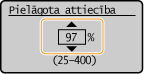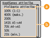 Varat palielināt vai samazināt kopiju izmēru, izmantojot iepriekš iestatītu kopēšanas koeficientu, piemēram, <A5->A4>, vai iestatot pielāgotu kopēšanas koeficientu ar 1% soli.