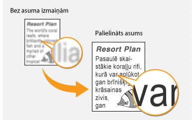 Ir iespējams koriģēt kopētā attēla asumu. Palieliniet asumu, lai padarītu skaidrākus izplūdušus tekstus un līnijas, vai samaziniet asumu, lai uzlabotu žurnālu fotoattēlu izskatu.