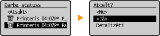Atcelšana, izmantojot utilītprogrammu Remote UI (Attālais lietotāja interfeiss)Drukāšanu var atcelt utilītprogrammas Remote UI (Attālais lietotāja interfeiss) lapā [Job Status]: Izdrukāto dokumentu pašreizējā statusa pārbaude