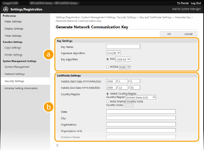 Raktą ir sertifikatą galima sugeneruoti naudojant aparatą, kai jie būtini užšifruotam ryšiui naudojant transportavimo lygmens saugą (TLS). Galite naudoti TLS pasiekdami aparatą naudodami priemonę „Remote UI“ (Nuotolinio vartotojo sąsaja). Su raktu ir sertifikatu, generuotu naudojant Network Communication, naudojami vartotojo pasirašyti sertifikatai.