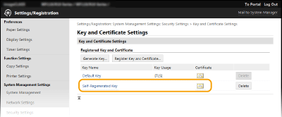 Rakto ir sertifikato negalima panaikinti, jei jie tuo metu naudojami kokiu nors tikslu, pvz., kai [TLS] rodomas dalyje [Key Usage]. Tokiu atveju išjunkite funkciją arba pakeiskite raktą ir sertifikatą prieš jį panaikindami.