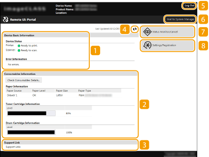 Prisijungus prie „Remote UI“ (Nuotolinio vartotojo sąsaja) rodomas šis portalo puslapis. Skyriuje aprašyti portalo puslapyje rodomi elementai ir pagrindinės operacijos.