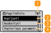 <Būsenos ekranas>Pasirinkite šį elementą, jei norite patikrinti spausdinimo būseną, peržiūrėti naudojimo istoriją arba aparato tinklo parametrus, pvz., IP adresą. Taip pat galima patikrinti aparato būseną, pavyzdžiui, dažomųjų miltelių likutį dažomųjų miltelių kasetėje ir t. t., arba peržiūrėti, ar įvyko klaidų. Ekranas <Būsenos ekranas>
