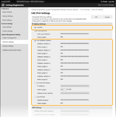 Aparato IPv6 adresus galima sukonfigūruoti naudojant priemonę „Remote UI“ (Nuotolinio vartotojo sąsaja). Prieš nustatydami IPv6 adresus, patikrinkite IPv4 adreso parametrus (IPv4 parametrų peržiūra). Kad galėtumėte naudoti IPv6 adresus, turite nustatyti tinkamus IPv4 parametrus. Atkreipkite dėmesį, kad IPv6 aplinkoje nėra nuskaitymo funkcijos, kuri naudoja skaitytuvo tvarkyklę ar MF Scan Utility. Aparatas gali naudoti šiuos IPv6 adresus: