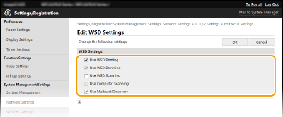 کادر انتخاب را برای دریافت اطلاعات مربوط به دستگاه از یک رایانه از طریق WSD علامت بزنید. این کادر انتخاب زمانی که کادر انتخاب [Use WSD Printing] علامت گذاری شود به طور خودکار علامت گذاری می شود. [Use WSD Scanning]