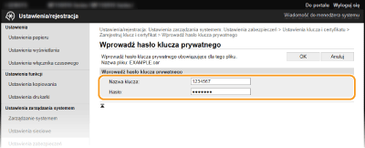 [Hasło] Używając znaków alfanumerycznych, należy w tym polu wprowadzić hasło prywatnego klucza dla rejestrowanego pliku.