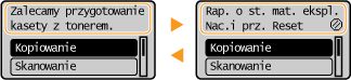 W niektórych sytuacjach po wystąpieniu błędu wyświetlone zostają wskazówki podające, jak na niego zareagować. Aby rozwiązać problem, należy postępować zgodnie z instrukcjami na ekranie. Poniżej jako przykład pokazano ekran wyświetlany w przypadku zacięcia papieru.