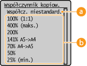 Istnieje możliwość powiększania lub zmniejszania kopii poprzez użycie wcześniej ustawionego współczynnika kopiowania, takiego jak <A5->A4>, lub ustawienie niestandardowego współczynnika kopiowania (z dokładnością do 1 %).