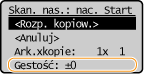 Jeśli tekst lub obrazy zawarte w oryginale są za jasne lub za ciemne, można wyregulować poziom zabarwienia kopii. Istnieje również możliwość automatycznego ustawienia optymalnego stopnia gęstości oryginału.