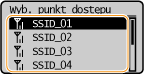 Istnieje możliwość wyszukania dostępnych routerów bezprzewodowych (lub punktów dostępowych) i wybrania jednego z poziomu ekranu urządzenia. Jako klucz sieciowy należy wprowadzić klucz WEP lub PSK. Przed wybraniem routera bezprzewodowego należy sprawdzić i zapisać wszystkie informacje niezbędne do przeprowadzenia konfiguracji, łącznie z identyfikatorem SSID oraz kluczem sieciowym (