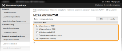 Zaznaczenie tego pola wyboru umożliwia uzyskanie informacji o urządzeniu przez komputer za pomocą interfejsu WSD. To pole wyboru jest zaznaczane automatycznie po zaznaczeniu pola wyboru [Użyj drukowania WSD]. [Użyj skanowania WSD]