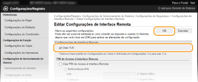 Utilizar o painel de controloTambém pode ativar ou desativar a comunicação TLS codificada a partir de <Menu> no ecrã Início. <Usar TLS>
