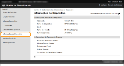 São apresentadas informações relativas à máquina e ao administrador de sistema. Essas informações são definidas em [Gerenciamento do Sistema] na página [Configurações/Registro].