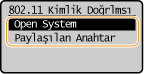 Paylaşılan anahtar kimlik doğrulaması kablosuz yönlendiricide ayarlandıysa, kablosuz LAN'a bağlanılırken makine bir kimlik doğrulama hatasıyla karşılaşır. Bu durumda makine otomatik olarak ayarı <Paylaşılan Anahtar> olarak değiştirir ve bağlantıyı yeniden dener.