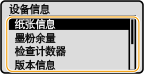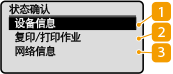 选择 <状态确认> 时,将显示一个画面,可供您检查文档处理进度,以及本机状态(墨粉盒中的剩余墨粉量等)和本机 IP 地址等网络设置。