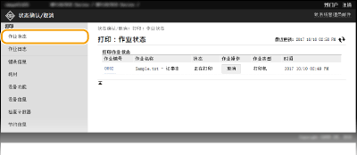 如果您以系统管理员模式登录,将列出当前打印和等待打印的所有打印文档。 如果以常规用户模式登录时输入了您的用户名,则打印的文档上将只显示您的用户名。 在暂停文档上单击 [作业编号] 显示详细信息。可以检查用户名和打印文档的页数。 |