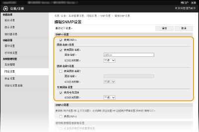 也可从 <菜单> 中指定 SNMPv1 设置以及启用/禁用 SNMPv3 设置。 <SNMP设置>