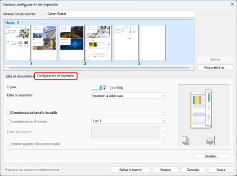 Puede utilizar Canon PageComposer para cambiar la configuración de impresión de un archivo.