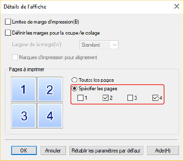 Boîte de dialogue [Détails de l'affiche] > [Pages à imprimer] > [Spécifier les pages] : [2] et [4]
