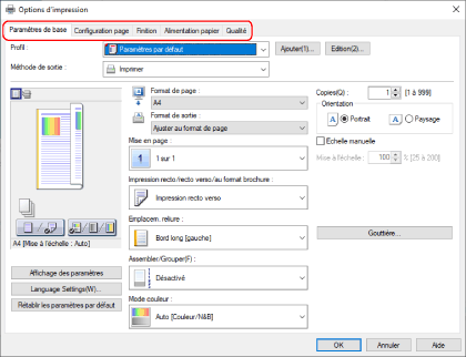 REMARQUESi la fonction que vous souhaitez utiliser ne s'affiche pas dans l'écran des paramètres d'impression, configurez les paramètres d'impression après avoir activé les fonctions du périphérique, en récupérant les informations sur le périphérique, etc.