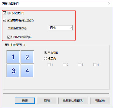 [海报详细设置]对话框:[打印页边距]、[设置剪切/粘贴边距]与[打印对齐标记]