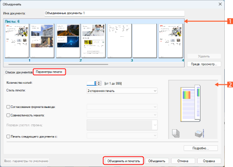 Несколько файлов можно объединить в один и распечатать его. Можно изменять настройки печати для редактирования объединенного файла с помощью Canon PageComposer.