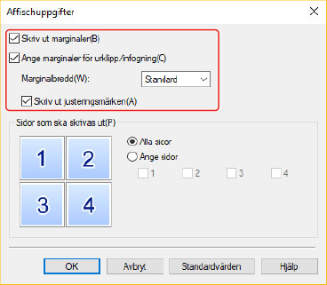 [Affischuppgifter]-dialogrutan: [Skriv ut marginaler], [Ange marginaler för urklipp/infogning] och [Skriv ut justeringsmärken]